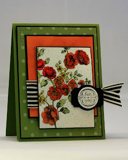 Here's a sneak peek of the Elements of Style stamp set in the upcoming Stampin' Up! Summer Mini that makes it debut on May 1st. This set is uber vintage. You're going to love it - especially if you like to color in your images! Personally, I'm not the greatest at watercoloring, but I took my best stab at it on this card. And you know what they say, "Practice makes perfect." It may be hard to see, but after I colored in my flowers using my Classic ink pads and a bender pen, I added Crystal Effects to the flowers. I also used a Basic Black marker and my color spritzer to add a more vintage feel to my card. The Pumpkin Pie panel directly behind my stamped image has been embossed with the Stampin' Up! Backgrounds 1 Textures Plate and my Big Shot. I used a sponge dauber and some Pumpkin Pie Classic ink to the embossed panel to help it stand out a little. I also added some paper piercing and the thick black stripeded ribbon to finish off my card.